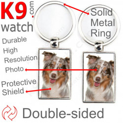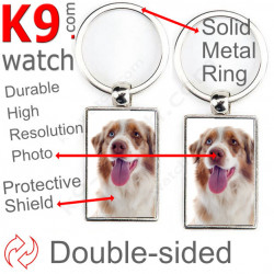 Metal keyring with your white and Red merle Australian Shepherd's photo on both sides, so you can always admire your pooch no matter where your keys are! Strong but light in the hand, it'll go everywhere with you!