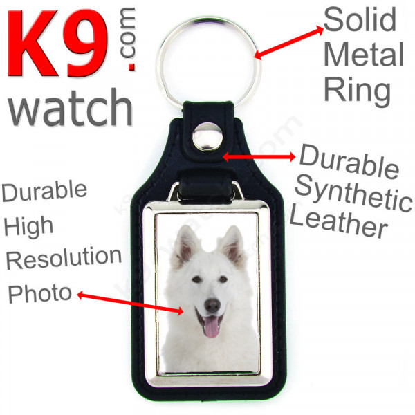 Keyring in synthetic leather and metal holder, with the photo of your Swiss White Shepherd, so you can always take your pooch with you! The black background makes the photo stand out. Strong but light in the hand, it'll go everywhere with you!