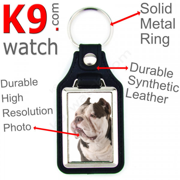 Keyring in synthetic leather and metal holder, with the photo of your brown chocolate and white American Bully, so you can always take your pooch with you! The black background makes the photo stand out. Strong but light in the hand, it'll go everywhere with you!
